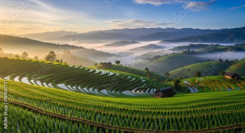 © Danu, Fototapeta premium Stunning panoramic view of terraced rice fields with morning mist and distant mountains.