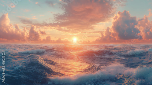 © Abu, Fototapeta premium Stunning panoramic view of the ocean at sunset, capturing vibrant sky and calm waters