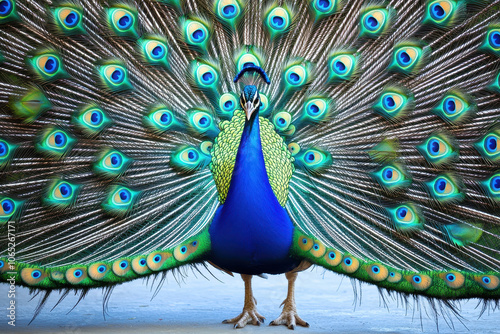 Obraz premium Stunning peacock displaying its vibrant feathers, showcasing brilliant colors and intricate patterns in a mesmerizing pose.