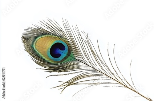 © mi, Fototapeta premium Stunning Peacock Feather Displaying Vibrant Colors Against White Background with Ethereal Elegance