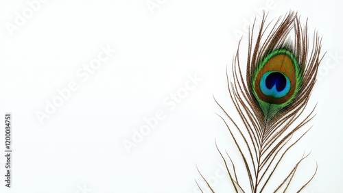 Fototapeta premium Stunning peacock feather with intricate patterns against a bright white background, perfect for artistic use and design