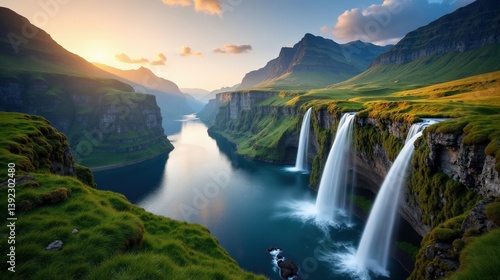 © Collse, Fototapeta premium Stunning photo of Seven Sisters waterfall in Norway at dawn, sunny sky, captured from a panoramic perspective.