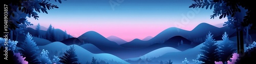 © Ross, Obraz premium Stunning Pink and Blue Mountain Landscape at Dusk with Silhouetted Trees and Soft Gradient Sky Creating a Serene Atmosphere in Nature for Wallpaper and Design