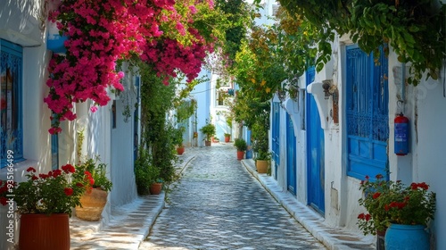 © Togrul, Fototapeta premium Stunning plant-lined historic street in Sidi Bou Said, Tunisia