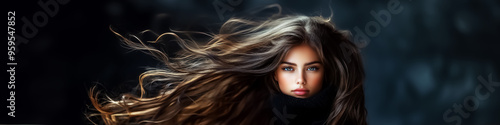 Obraz premium Stunning portrait of a young supermodel with flowing hair, perfect for winter fashion campaigns and social media content. Design for Wall Art, Poster Print, Wallpaper & Background