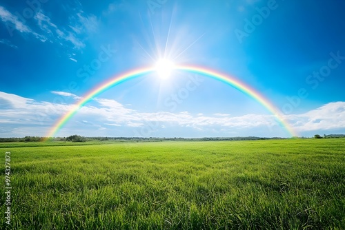 © ruangrit19, Obraz premium Stunning Rainbow Arch Over Lush Green Meadow and Clear Blue Sky Landscape