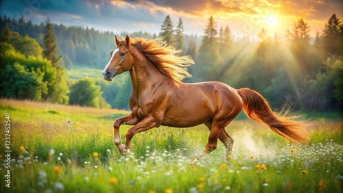 Fototapeta premium Stunning red mare, springtime elegance, captured in a breathtaking equestrian...