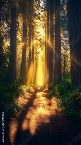 © Siriroj, Obraz premium Stunning Redwood Forest Scene with Magical Sunbeams Illuminating the Path