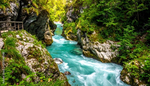 Naklejka premium Stunning river cuts through canyon, verdant trees, and natural pathways