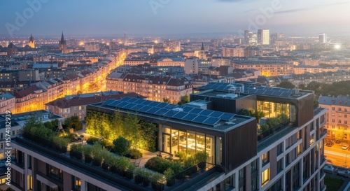 Obraz premium Stunning rooftop garden with lush greenery and solar panels sits atop a modern building, overlooking the illuminated cityscape at dusk, showcasing sustainable urban living