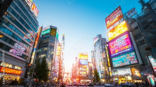 © Jakkarin, Obraz premium Stunning Rooftop View of Vibrant Commercial District at Dusk