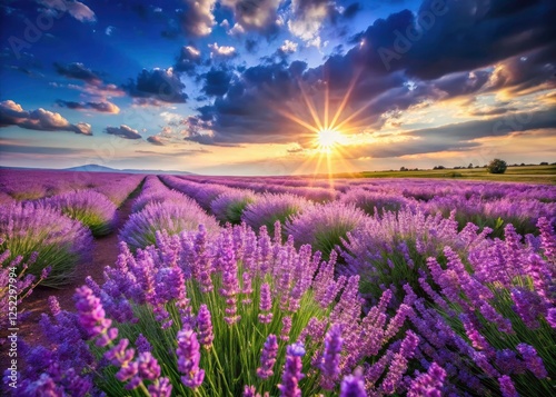 Fototapeta premium Stunning rural landscape photograph: a sunlit lavender field explodes with...