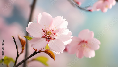 Fototapeta premium stunning Sakura cherry blossom scene, with pink flowers blooming under clear spring skies, capturing the essence of nature’s rebirth.