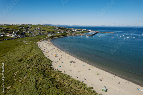 Fototapeta premium Stunning sandy beach and blue ocean and sky. Aerial view. Mullaghmore town area in county Sligo, Ireland, Popular travel destination with beautiful nature scenery and water sports. Warm sunny day.
