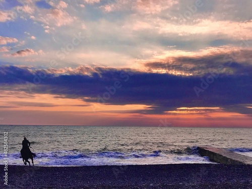 © Anton, Obraz premium Stunning seascape. The rider on a horse at sunset on the beach. The person horse riding.