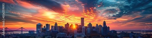 © Ross, Obraz premium Stunning Seattle Skyline at Sunrise: Captivating Early Morning View of Downtown with Vivid Colors Lighting Up the Sky and Iconic Landmarks