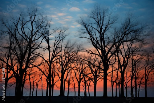 © nsit0108, Obraz premium Stunning silhouette of bare trees against a beautiful orange and blue sunset sky