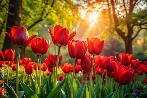 © Four888, Obraz premium Stunning Silhouette of Red Tulips in Spring Park Garden Natural Background