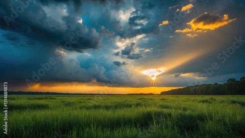 © Holo Frame, Fototapeta premium Stunning sky above a field following a thunderstorm.