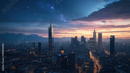 © Espresso, Fototapeta premium Stunning skyline at dusk with vibrant colors illuminating the cityscape under a starry sky.