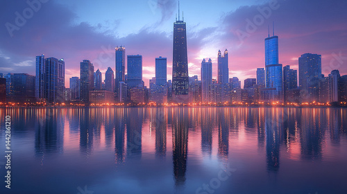 Fototapeta premium stunning skyline dusk with reflections water, showcasing modern architecture...