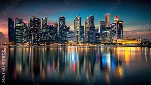© Noppakun, Fototapeta premium Stunning Skyline Reflection at Dusk in Urban Setting