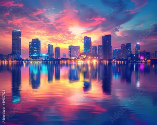 Fototapeta premium Stunning skyline reflection at sunset, showcasing vibrant colors, modern...