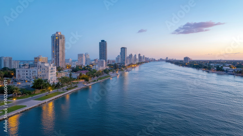 Fototapeta premium stunning skyline view featuring modern buildings along serene river dusk,...