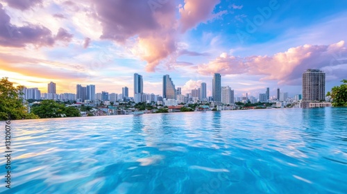 © Ratchanee, Naklejka premium Stunning Skyline View from Infinity Pool at Sunset in the City