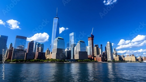 © Generative AI, Obraz premium Stunning skyline view of a modern city with vibrant buildings under a bright blue sky and fluffy clouds : Generative AI
