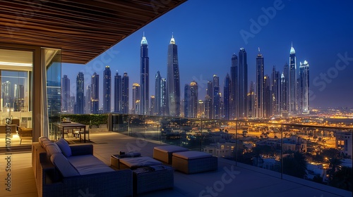 © Benjarin, Obraz premium Stunning skyline view of modern skyscrapers at night in Dubai.