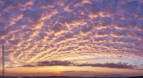Obraz premium Stunning skyscape at dusk featuring dramatic purple and orange altocumulus clouds creating a breathtaking mackerel sky effect