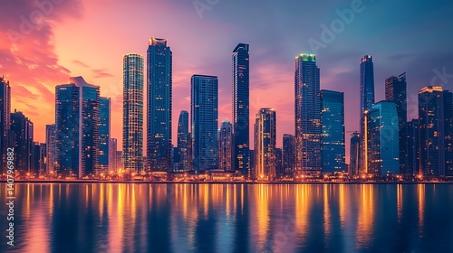 © joydeb, Obraz premium Stunning skyscraper skyline at sunset in city high resolution picture