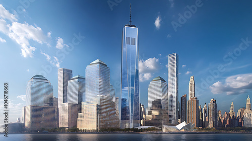 © Chonthicha, Obraz premium Stunning skyscrapers rise against clear blue sky, showcasing modern architecture