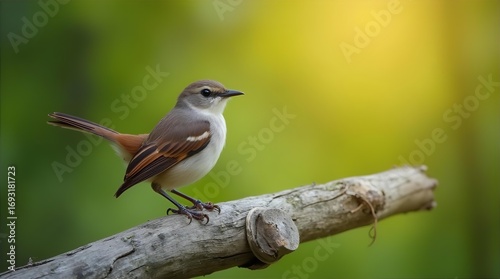 Obraz premium Stunning small bird with brown wings, white underparts, and reddish tail perched on a weathered wooden branch, bathed in golden sunlight against a vibrant green bokeh.