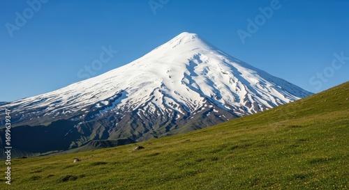 © Asha Moni, Fototapeta premium Stunning snow capped volcano mountain against clear blue sky in summer