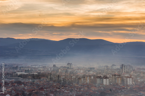 © Nikola, Fototapeta premium Stunning, soft view of golden sunset sky above scenic cityscape covered by haze and mist