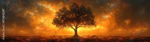 Naklejka premium Stunning solitary tree silhouetted against a dramatic, fiery sunset sky,...