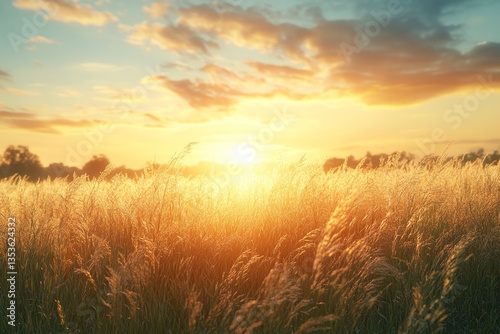 © Julia, Fototapeta premium Stunning summer meadow at sunset, golden clouds above, warm glow over fields. Concept of summer meadow showcasing seasons' beauty and tranquility.