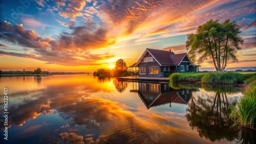 © Sunee, Fototapeta premium Stunning Sunrise Lake House Photography: Rule of Thirds Composition, Golden Hour, Water Reflection