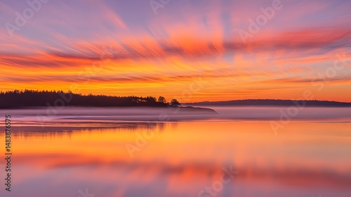 © Laily, Fototapeta premium Stunning Sunrise over Calm Lake with Misty Fog and Colorful Sky