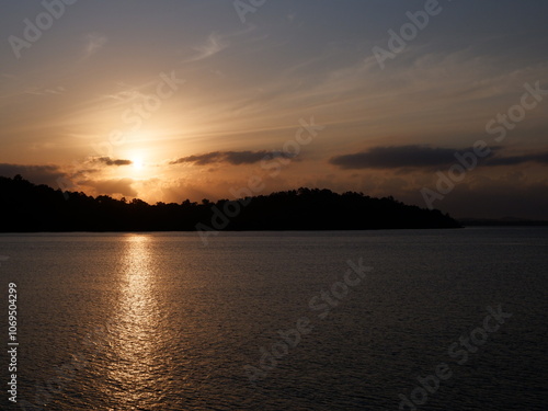 © Tamlikho, Naklejka premium Stunning sunrise over Kotabaru beach, South Kalimantan, casting golden light on tranquil waters and creating a serene coastal scene