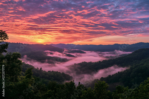 © Usman, Fototapeta premium Stunning sunrise over misty mountains with a colorful sky