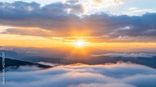 Fototapeta premium Stunning sunrise over mountains casting golden light on cloud sea in serene...