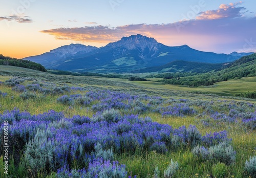 Fototapeta premium Stunning Sunrise Over Purple Wildflowers in Mountain Valley Setting with Majestic Peaks and Clear Sky, Creating a Breathtaking Natural Landscape Experience