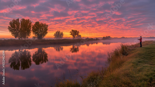 © Latthaphon, Obraz premium Stunning sunrise over reflective calm river