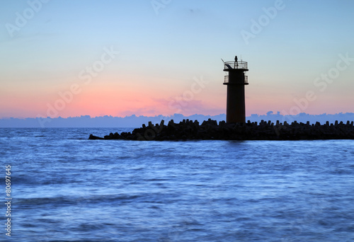 Fototapeta premium Stunning sunrise over sea with lighthouse