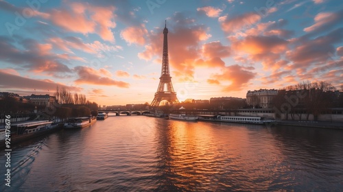 © Qstock, Obraz premium Stunning Sunrise Over the Eiffel Tower and Seine River in Paris - Majestic Cityscape Photography