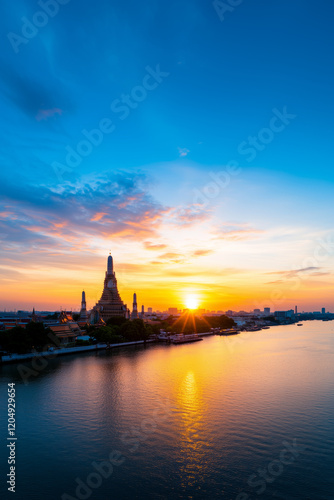 Obraz premium stunning sunrise over Wat Arun, reflecting golden light on river