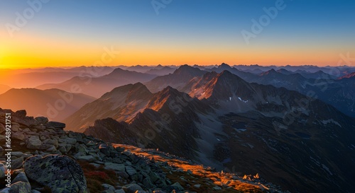 Fototapeta premium Stunning sunrise paints the rugged mountain peaks in warm golden light, inspiring adventure and exploration, perfect for travel, nature, and scenic landscape projects